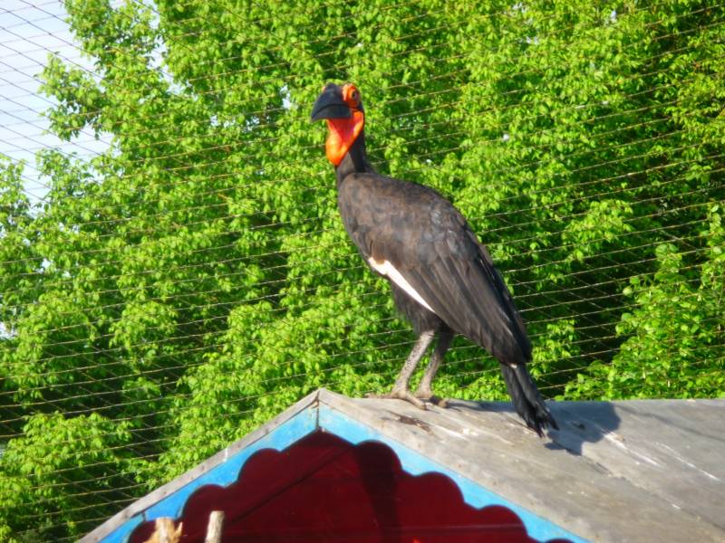 Il a un gros bec noir recourbé surmonté d'un petit casque arrondi. ce grand bec lui permet d'attraper des insectes, mais aussi des petits rongeurs et reptiles. Il a une zone de peau nue rouge vif autour de l'oeil et sur le devant du cou. Son cri, des notes basses et résonnantes en "oum-oum" rappellent fortement le rugissement du lion.