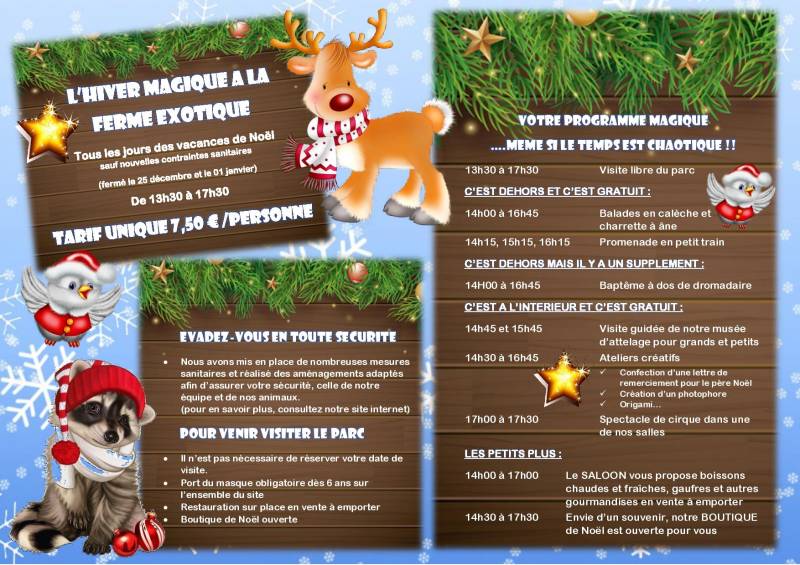 Durant le confinement, nous n'avons pas chômé ; en plus de nous être occupé de nos pensionnaires et de l'entretien du parc, nous vous avons concocté ce programme magique tout en ayant mis en place un protocole sanitaire strict nous permettant de vous retrouver en toute sécurité.